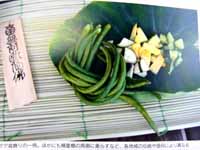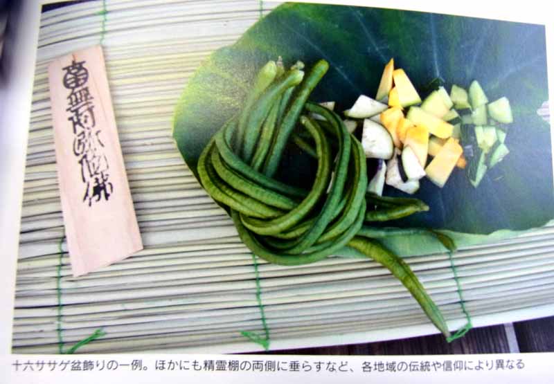 8月13日の盆入りには盆棚を作り、「カワカンジョウ」という南無阿弥陀仏と墨で書かれた経木、餅や団子、そうめん類、柳の木で作った箸、キュウリの刻んだものや十六ささげ |