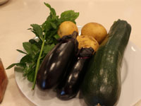 下からサラダ菜・ナスのグリル・TOKYO Xロースの低温ロースト・井之口さんの早稲田ミョウガタケピクルス入りトンナートソース・早稲田ミョウガタケのピクルス