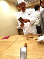 会終了後、中川さんに話を聞く、やっぱり包丁について。薄い包丁と厚い包丁、毎日研ぐ…