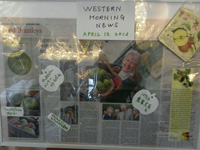 新聞が飾られています。この人は誰かしら?似た女性が会場内にいます。 |
