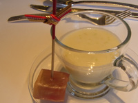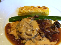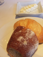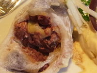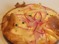ブリオッシュにホワイトソース、薄切りに玉ねぎスライス、ベーコン、干した細切りブラムリー |