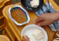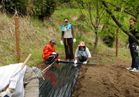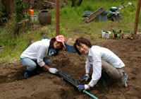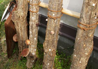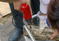 ースとバニラアイスのベストマッチング。たっぷりかけていただきます。休憩後は椎茸菌植え付け作業へ。ナラ?の木があり、利用するために水に浸け、椎茸栽培をすることにしたらしい。マジックで菌を植えつける場所に印をつけ、ドリルで彫ります。おもしろいけれど、あまりにも開けるべき穴が多過ぎて飽きてしまう。途中で投げ出した?