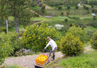 50年も経つみかんの樹が段々畑に点在し、たわわ夏みかんを実らせています。とてもきれいな景色。棚田もよいけれど、段々畑も好きです。かごに夏みかんを切り取り、それからコンテナに入れていきます。そして電気の台車で降