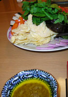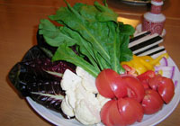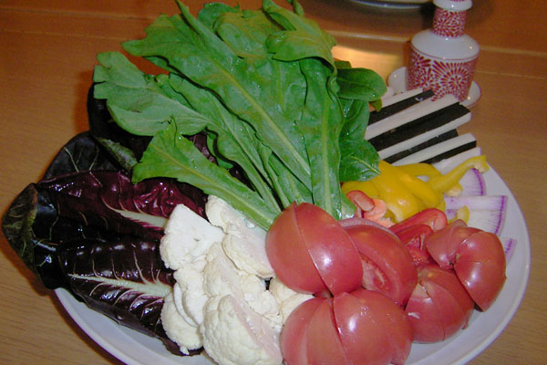 と紫色。アントシアニンが半端なく豊富。白菜はイエロー白菜。トレビスっぽいのはやたら苦い。バーニャカウダソース、タラモソース、アボカドソースをつけて食べます。