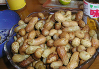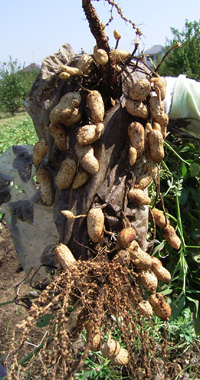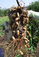 落花生の苗を抜いていきます。取り上げるとこんなに実が生っています。(クリックで拡大)実の下には根粒が。実をひとつひとつはずしていきます。ピーナッツは地中で育つものだったとは。Mさんのところではマルチを愛用しており、水の蒸発を防ぎ、地中の温度を温かく保つとのこと。