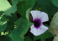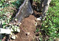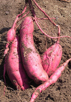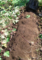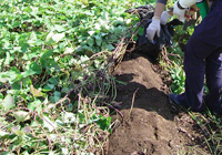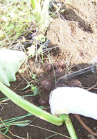 葉を隣の畝との間にずらします。そしてマルチの穴からでている茎をチョッキンと切り、マルチをはずします。先ほど切った茎の下には・・・こんなにたわわなサツマイモが。紅あずまです。その後、紫芋も収穫。 |
