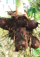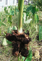 さあ、里芋の収穫へ。茎を抜くと、こんなに。茎の下に親芋、孫芋と連なります。芋をむしっていき、最後に茎と親芋を包丁でカットします。残った茎は短く切って今刈り取ったばかりの畑に撒いていきます。
