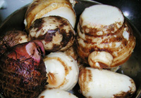 に実を多く削ることなく向けます。ごみも少量化に貢献です。赤めの里芋はむけず。そのほかのものも楽しみながらいただきます。せっせと作らないとなー。