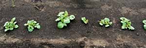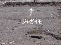 ジャガイモはいちばん東。タネイモを2分の1にカットし、9個植える。間に肥料を置く。