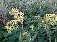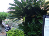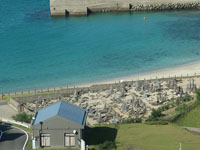 白浜地区の海岸の東側一角に頭ヶ島教会の共同墓地がある。5月中旬には一面にピンク色のマツバギクの花が咲き、背景の海の青と対比摺るように美しい景観が現れる。 |