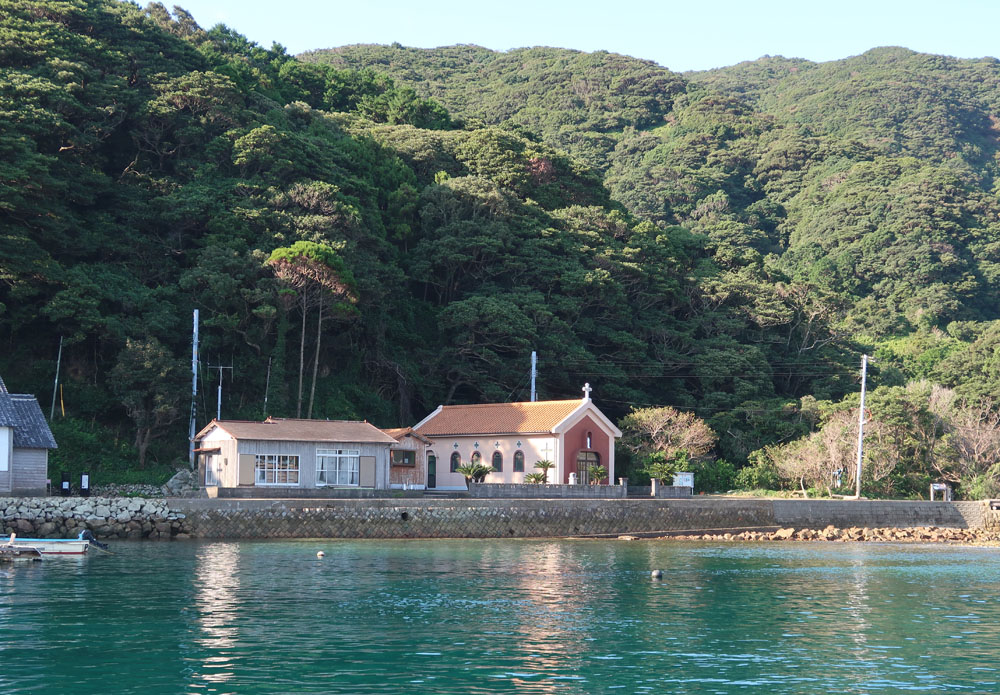 旧五輪教会堂の建つ港のポイント、船で乗り付け、そのまま見学してまた船から奈留島へという移動