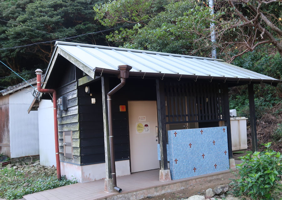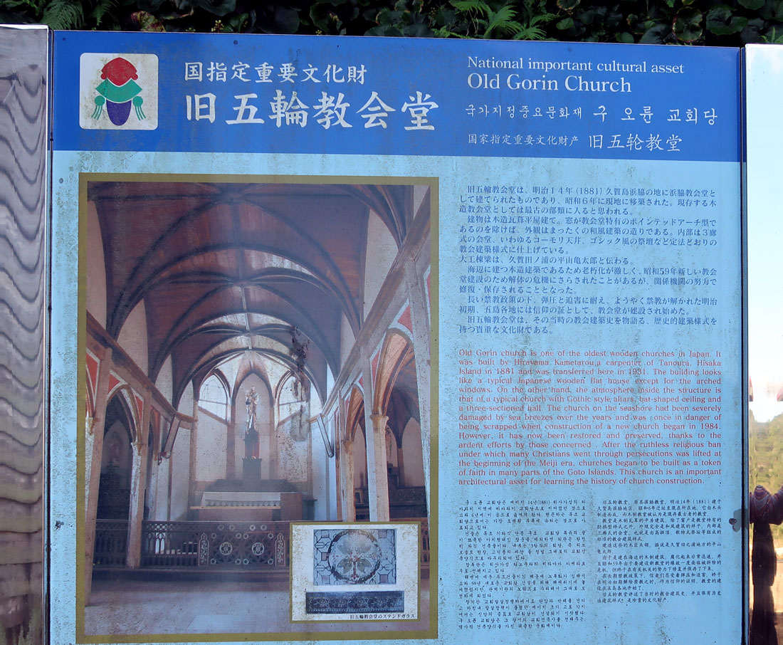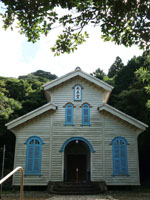 久賀島で初めて建てられた初代浜脇教会堂は、久賀島の東岸、五輪集落に移築され、旧五輪教会堂として現存。 |