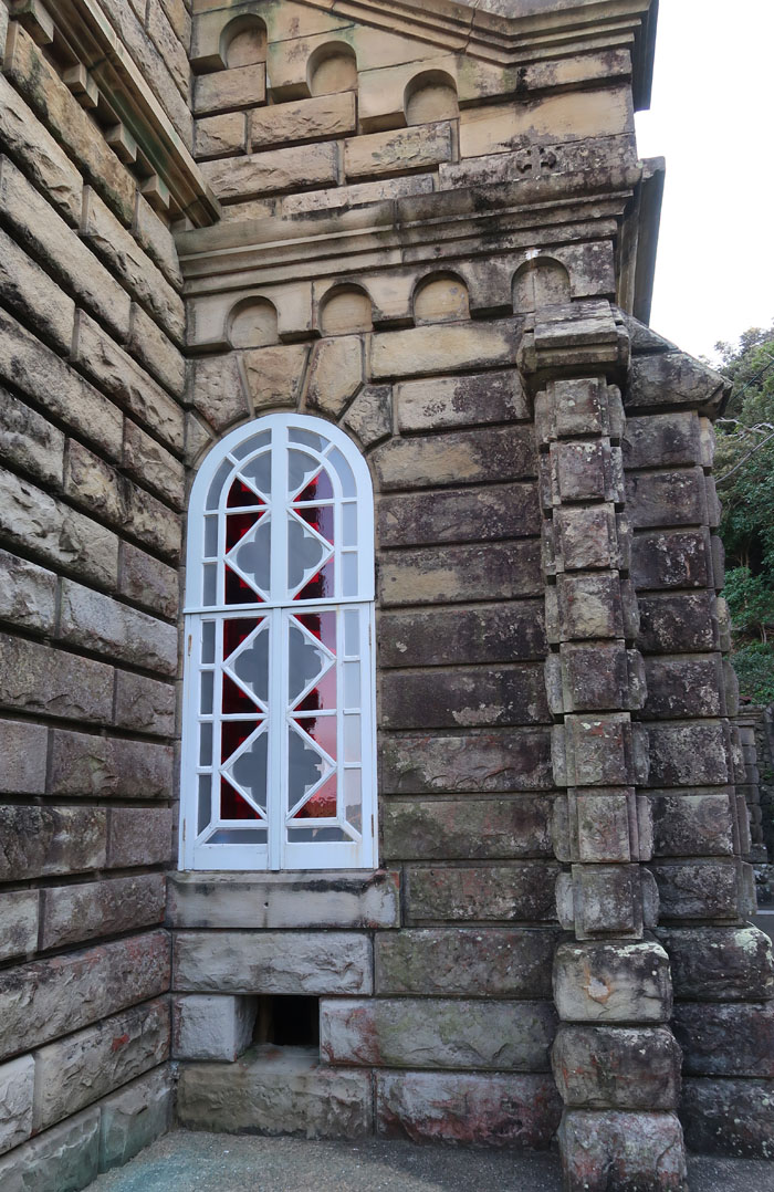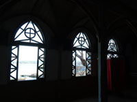 ステンドグラス、青=天、緑=草木、赤=太陽、黄=大地を表す |