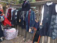 着物リメイクでも柿渋のものが多い店。履いていったパンツの上からいくつか店奥で試着、食器、バッグ、アクセサリーもあり |