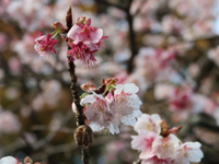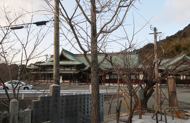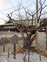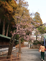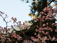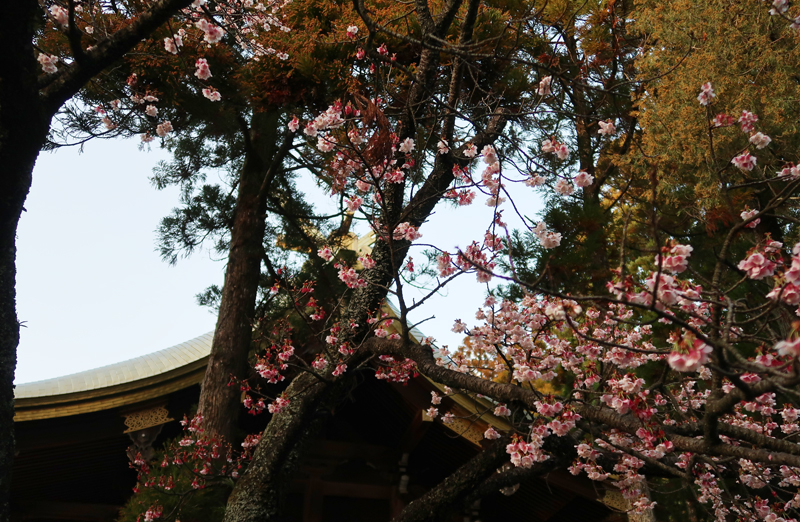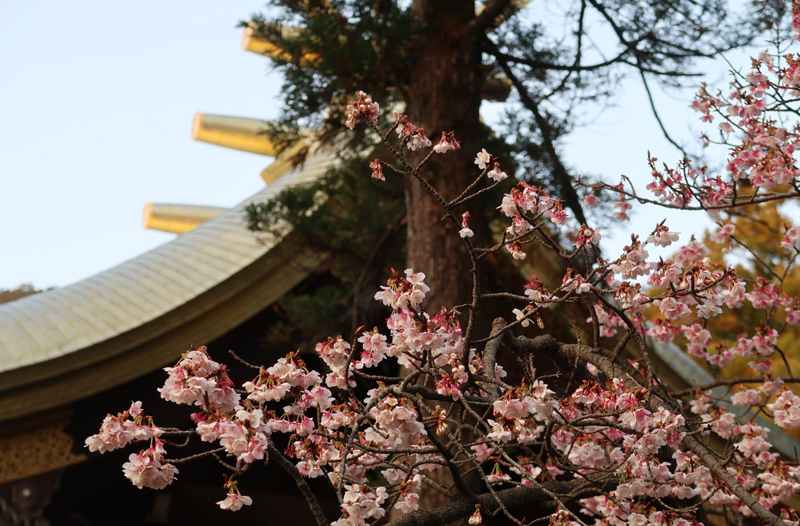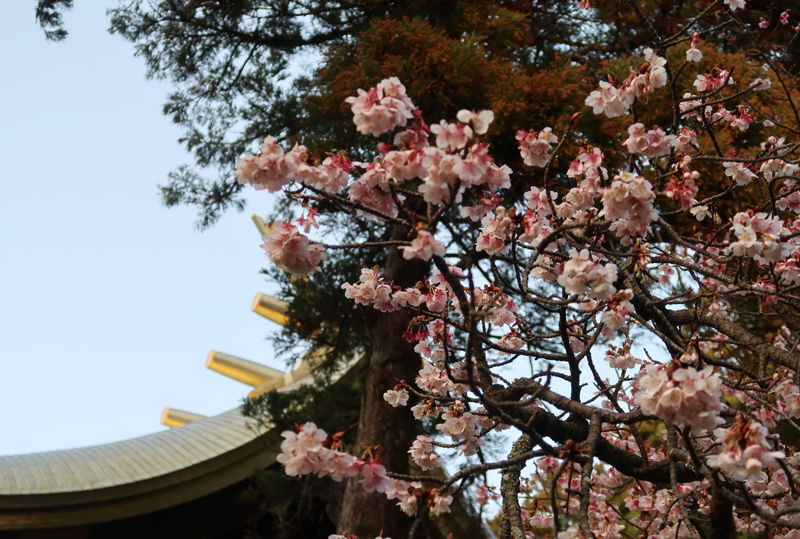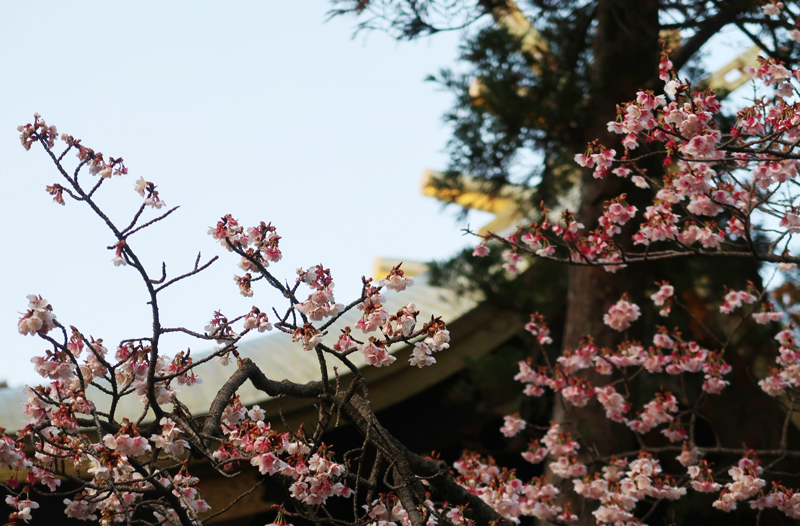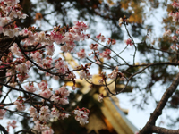 | 早咲きの桜、本殿の金色屋根 |