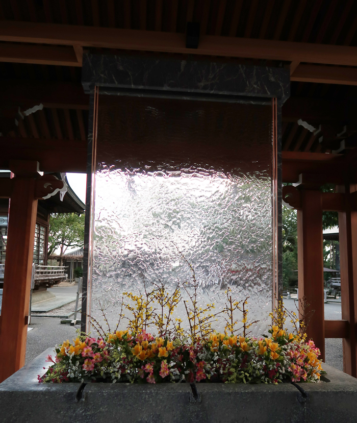 生花が飾られて上から水がガラス壁を伝い落ちてくる