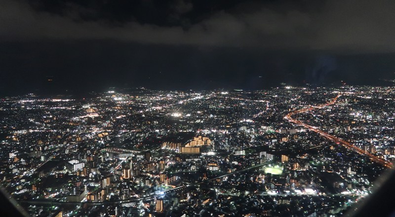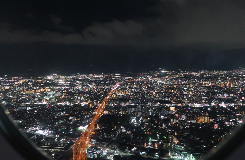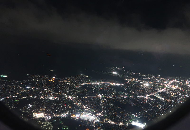 無事、時間内に福岡空港到着。博多明太焼き鯖ずし購入し、機内で食べる。おいしかったが塩辛い。20時定刻福岡空港離陸。上空の様子。 |