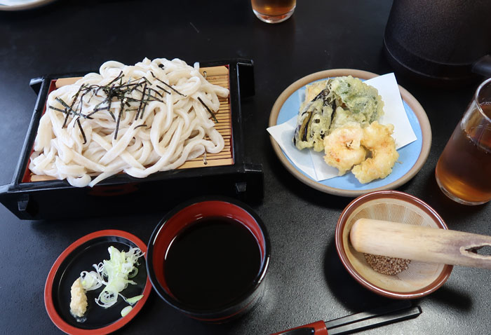 地粉で色も精白されておらず少し薄茶色、太めでおいしい。天ぷら付き