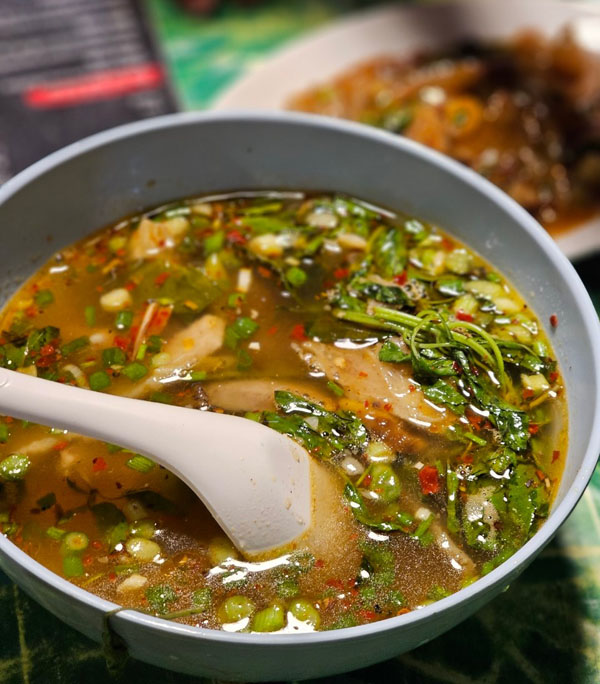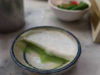 スイーツ系か・・・、ココナッツの層の下にグリーン、これ、パンダンリーフの煮出し汁のお菓子だ。