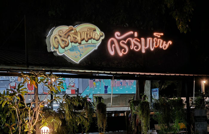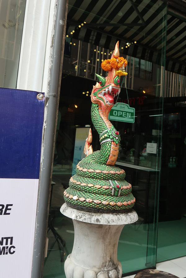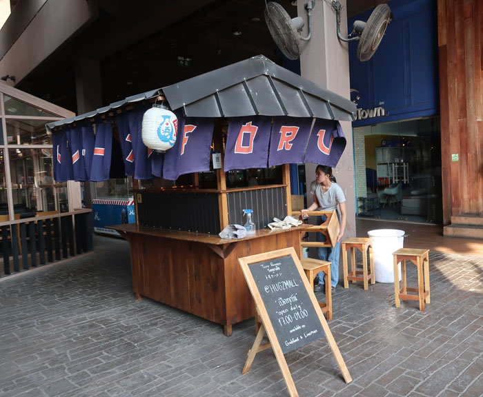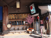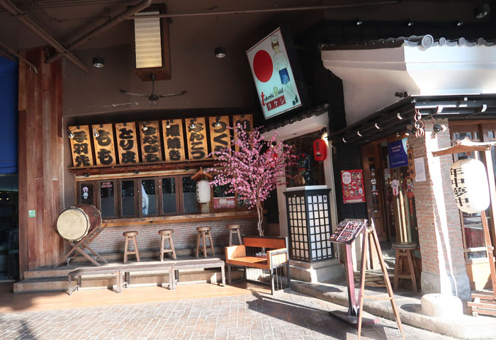 カフェの周りの様子、屋台のような店、日本語の書かれた店。日本食は人気。
