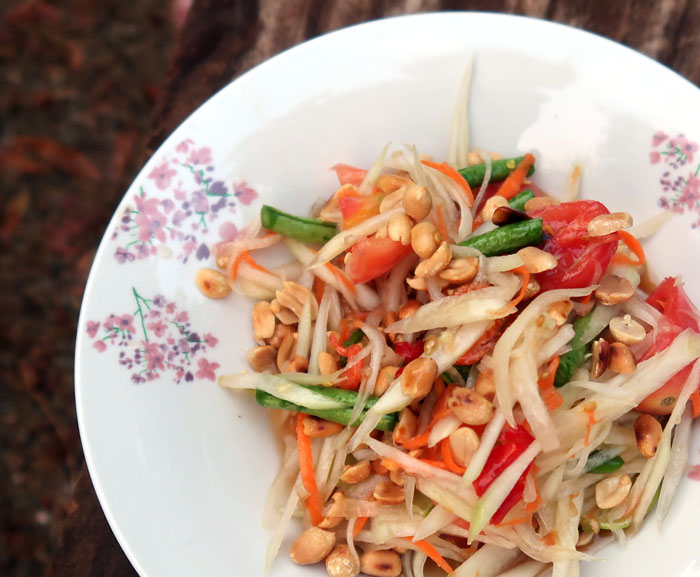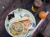 タイグリーンカレー(激辛)、そうめんがあってそれにかけるとよかったみたい。おいしい。辛い。 ソムタムも。明るいうちから飲んで、食べて。