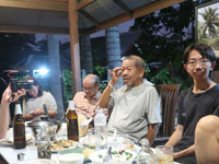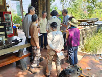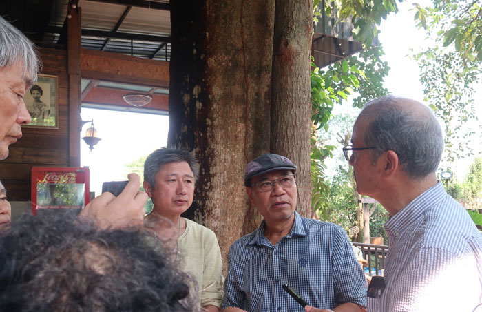バンさんの家のあるサムソットは農家が多く、果物・ココナッツを作っている人が多い。工場地帯ができ、農業をやめて工場で働くようになった。1992年大きな道ができるが、交通手段は川の具ね交通。ミャンマーからの労働者が増えてきた。問題を問題としてとらえていない。果物価格が上がる。後継者がいないのが現実。水上マーケットでは物々交換、魚屋野菜売りから洋服を売るようになった。5人兄姉の長男。9歳の時に父が亡くなる。母は市場で菓子を売る。小さな時から新聞を読む。大学入学前10月14日政変で、活動に参加。1973年大学入学、3年後、10月6日事件、森に入り、地下に潜る。1978年大学はオープン大学で、出る時たいへん。2年で中退、実際に働いた方が感動得られると。パタヤホテルNGOで働く。 |