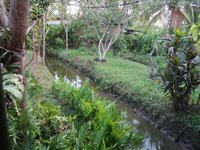川が、リゾート内に小さな小川となって流れ込む、そこかしこにテーブルと椅子 |