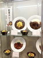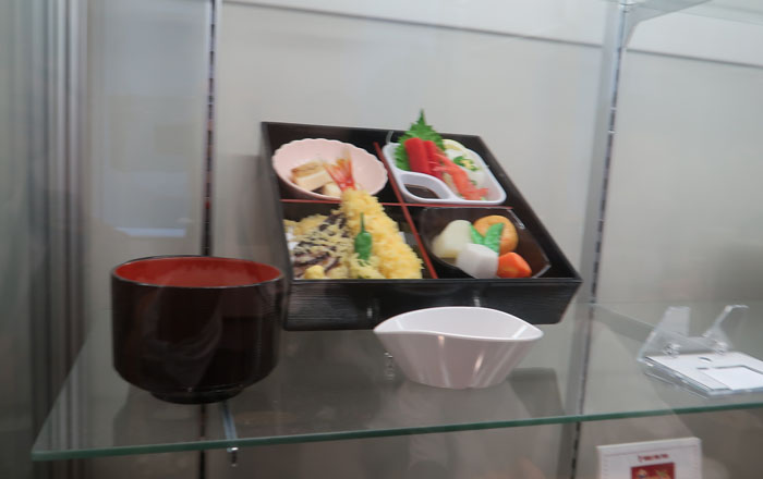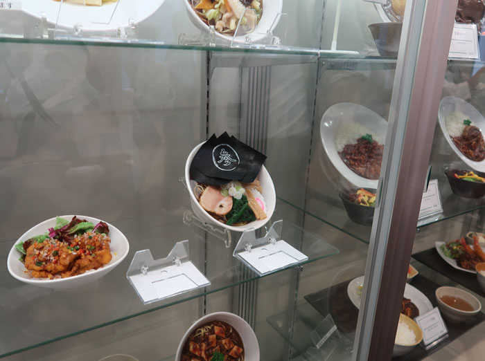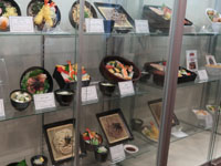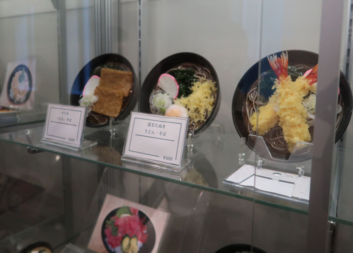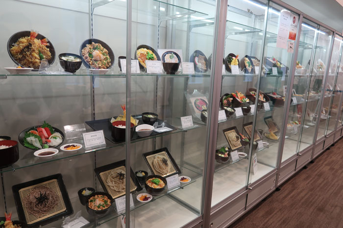 | 広々とした食品サンプルショーケース、値札が伏せられているもの多し |
