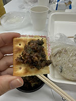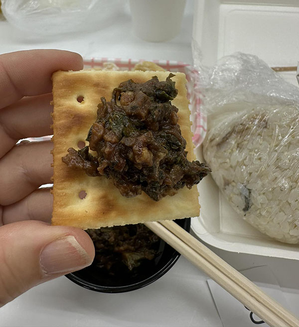 大島の明日葉と豚肉TOKYO Xの江戸味噌 クラッカーにのせて