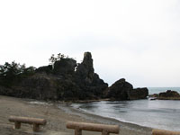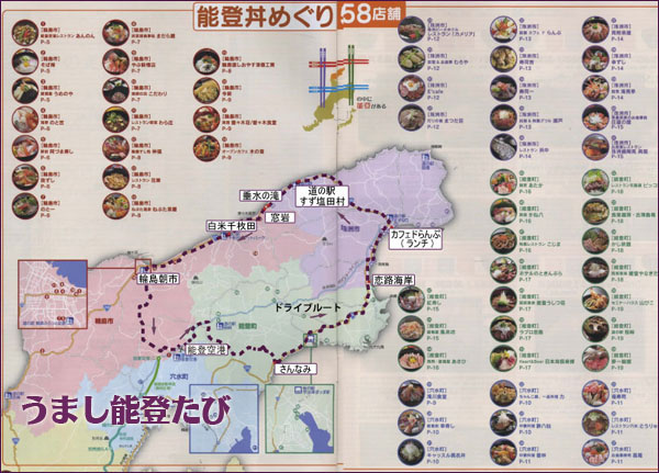 ソフトクリーム岩です。注意書きがしゃれが効いています。 その後、珠洲市のカフェでランチ。ほかにほとんどお店がありませんでした。ガイドブックで見つけたこの店ですが、夜は和食でしょうということで、パスタランチ。スープは紛れもなくキャンベルの缶詰でした。カフェレストランではありえません。パスタはいろいろ野菜とベーコンのしょうゆ味。外側が紅い大根を焼いたものが入っており、おいしかったので、もっと入れてほしかった…。1470円。コーヒーが付いてこの値段なら納得できるのだけれど…。能登情報をより多く載せたガイドブックを購入しましたが、それでも情報が少ない。空港で「能登丼」なるパンフレットを手に入れるも、急いで車を走らせる身にとって、到着空港で手にするパンフ、じっくり見ている暇はない。「能登丼」のパンフにはたくさんのランチ可能な店舗が載っていました。能登牛、魚、牡蠣…。TOPタイトルの能登丼めぐり58店舗参照、こんなに店があったとは。