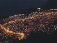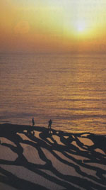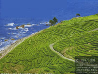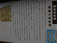 パンフレットから美しい景色。夕焼け、あぜにLEDライトが光る「あぜの灯り」は秋。田植えは5月中旬、稲刈りは9月中旬。