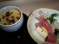 お品書き---梅酒、黒胡麻豆腐、五種盛り、茶碗蒸し、お造り、ぶり治部煮、能登豚陶板焼き、ずわい蟹酢の物、かじめうどん海老掻き揚げ添え、能登コシヒカリ、胡瓜壷漬け、黒胡麻プリン