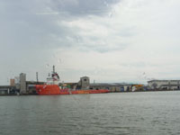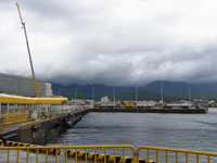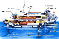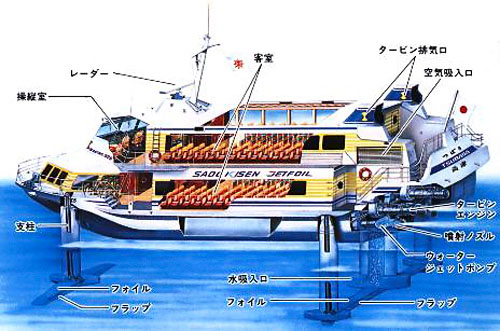 ジェットフォイルすいせい。設計はボーイング社です。船体を海面に浮上させて走行することで、3.5mの荒波でも時速80kmの超高速で走行。ガスタービンエンジンで駆動されるウォータージェットポンプにより1分間に約150トンの海水を1平方センチメールにつき9kgの高圧力で噴射させて前進。