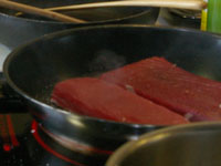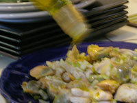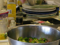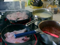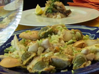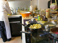 料理ができあがり、テーブルに並びます。奥田シェフがシャンパンを開け、食事タイムへ。