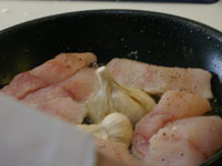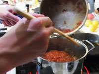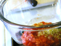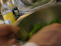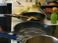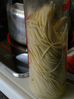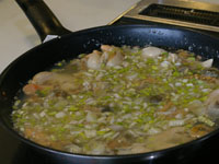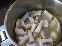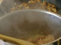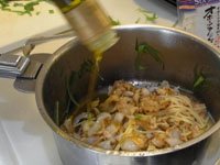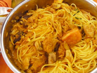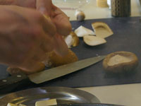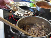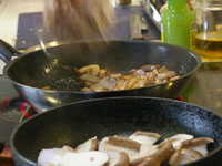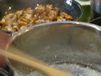 スパゲッティ・アル・ボスカイオーラは木こり風。味の椎茸、香りのマッシュルーム、食感のエリンギの3つキノコを楽しみます。浸水パスタは水を切って1分茹でます。「60秒数えてください。」と言われますが、その前に手が…タイマー1分を設定。