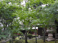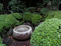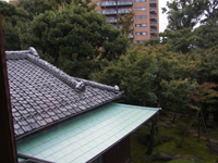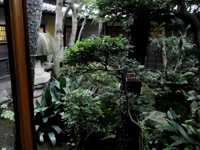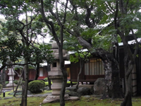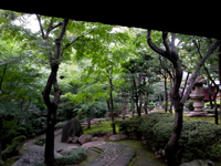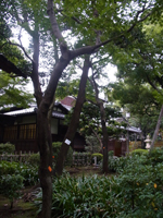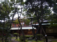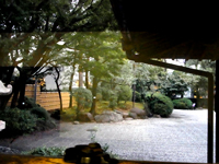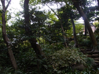 暗くなりそうなので、庭から見学します。庭門をくぐります。崖線という地形を取り入れた回遊式庭園で、春はツツジの花、秋はモミジの紅葉を楽しめるとのこと。 |