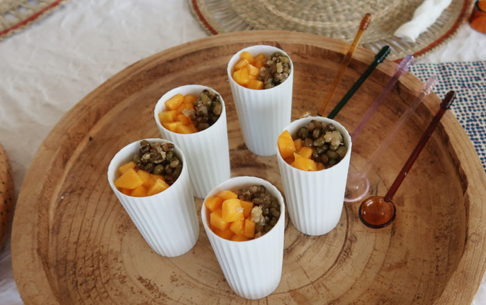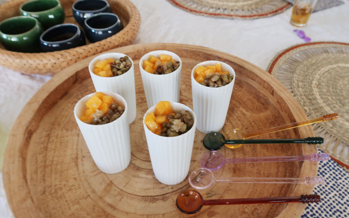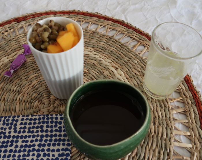 そして豆花トッピングに緑豆甘煮と柿 |