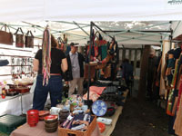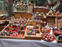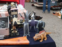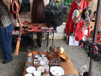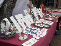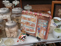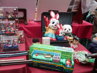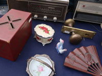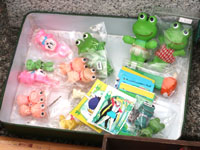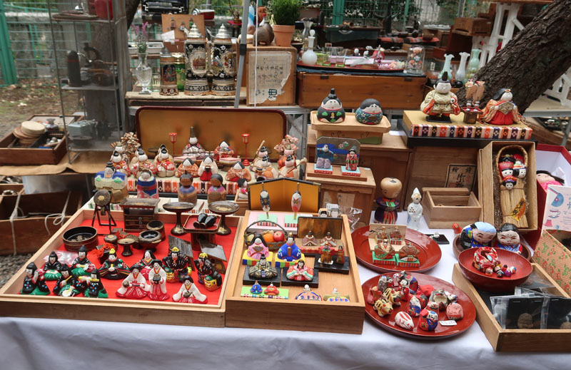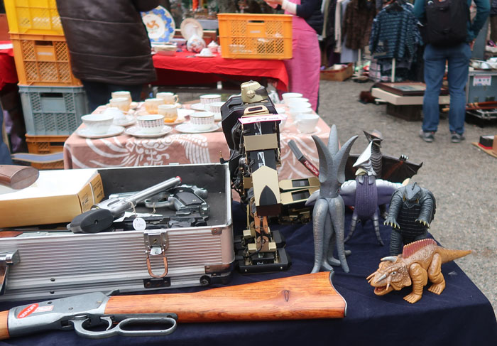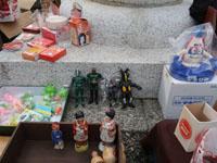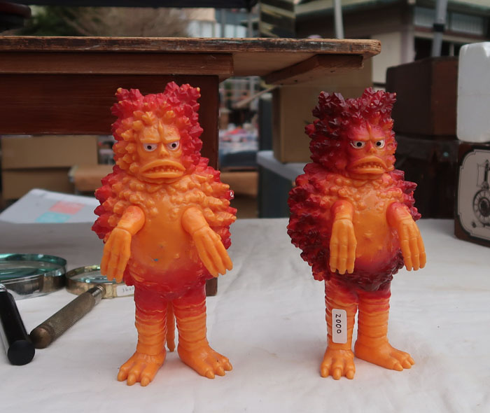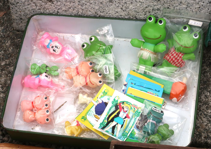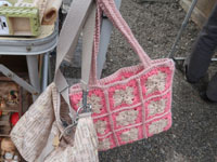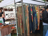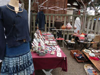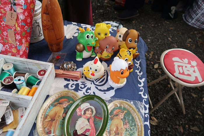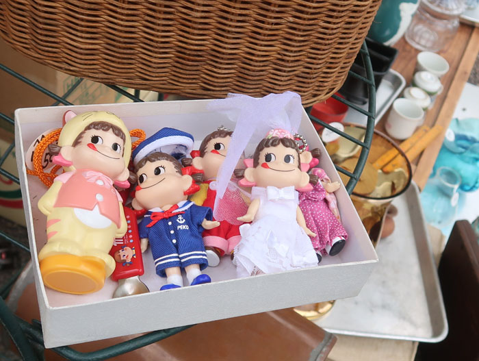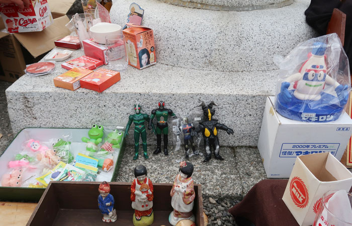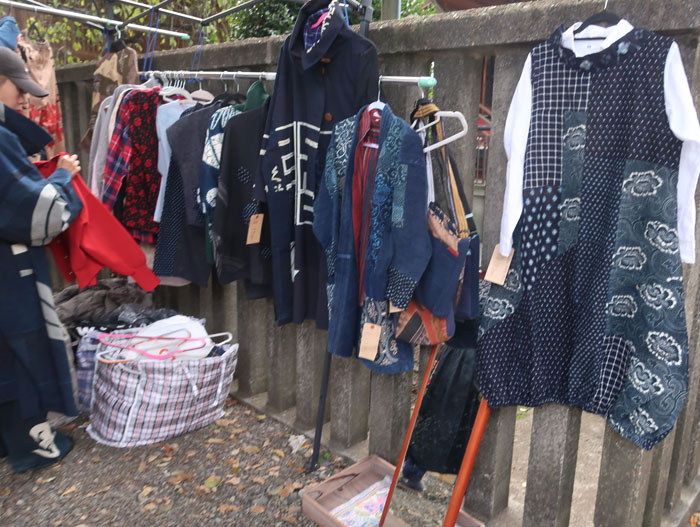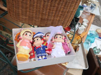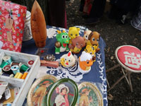 絣のリメイク品以前はいくつかあったぐっと増えた。ブームなのか。絣の店に古いゴム人形の一団。ぐるっと回ってきたら消えていた。売れたんだね。 |