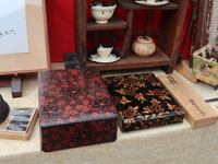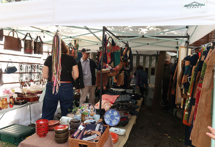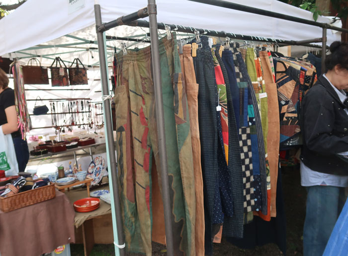 着物リメイクでも柿渋のものが多い店。履いていったパンツの上からいくつか店奥で試着、食器、バッグ、アクセサリーもあり |