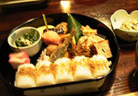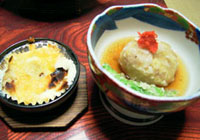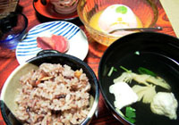 二日目宿泊先の夕食の珍しいバナナのグラタンといちじくの天ぷら。朝食に大豆肉の生姜煮がありました。まるで豚肉のようでした。昔、動物性たんぱく質がなく、生みだした工夫の食品でした。インドネシアのテンペ、中国の生麩といったところでしょうか。 古代米は桜海老入り。赤蕪の漬物。