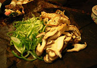 朴葉味噌定食です。朴葉の上に赤味噌、ねぎ、椎茸油揚げがのっていて、それを焼きます。