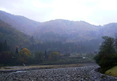 川を隔てて大駐車場が設営されていました。その川の橋の上から。この後、五箇山に寄りました。五箇山(富山県)も合掌造りの民家の集落があり白川郷とともに世界遺産に指定されています。
