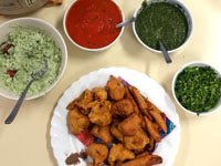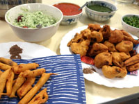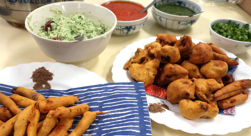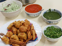 【エヌと少し泉】マンガロールバナナバンズ/魚介のマサラフライ/パコラ/鯖とコクムのケララ風/チキントマトスープ/チャトニ各種(ココナッツ・トマト・コリアンダー)