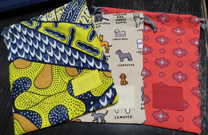 給食袋追加言われ、作る。ナイジェリア布でも1つ作る。(3/12) |