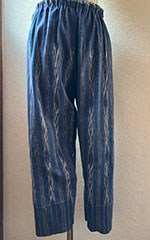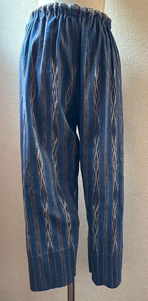 藍色絣パンツは、広げて紐でぐるぐるっと巻いて閉じる形のパンツ。(私も以前同じ形のものをもらったことあり。)それをもんぺに直す。丈はそのまま。