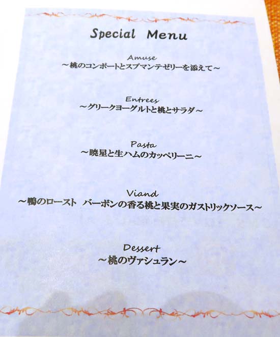 透過式光センサー糖度12度以上「あかつき」をふんだんにつかった、渋谷PATINASTELLAエグゼクティブシェフ杉浦仁志氏による、この日限りのスペシャル桃コース。