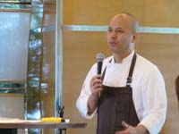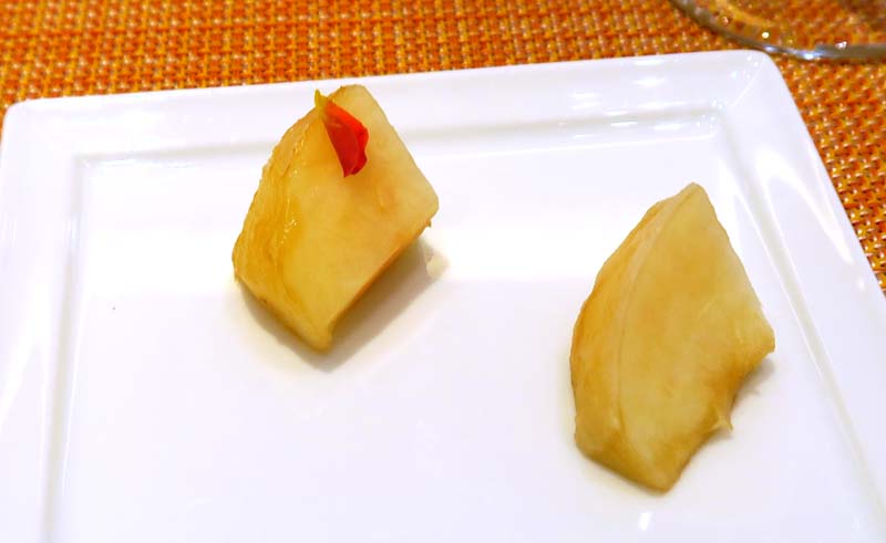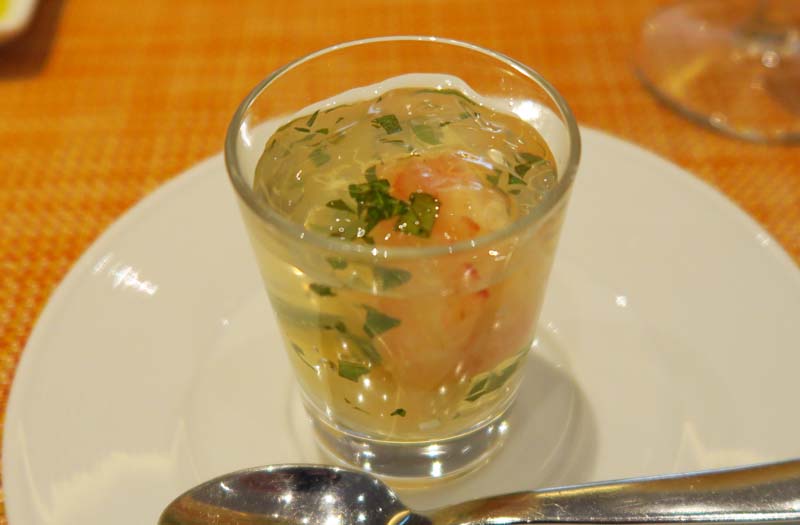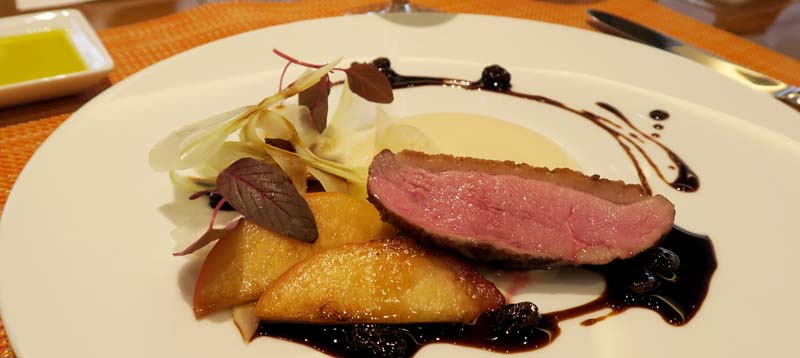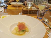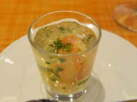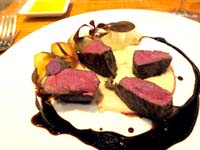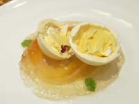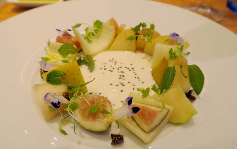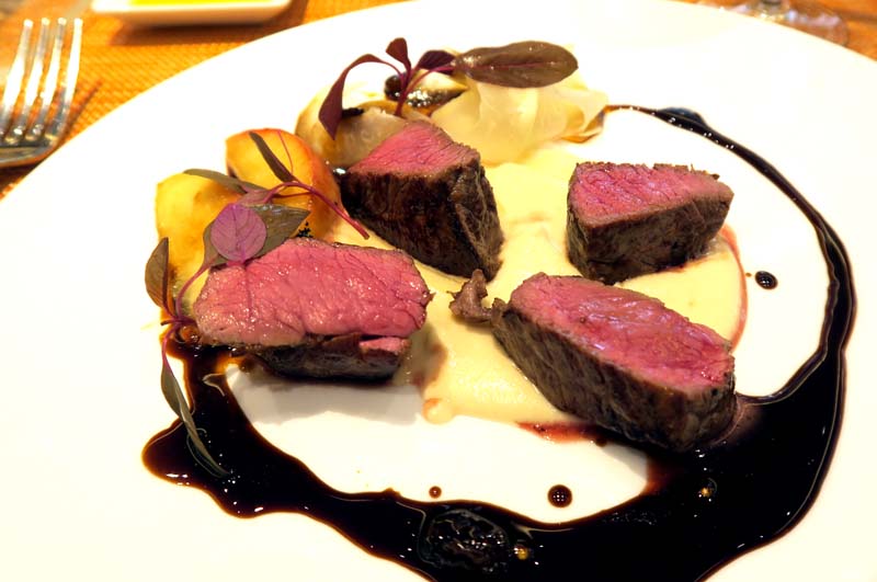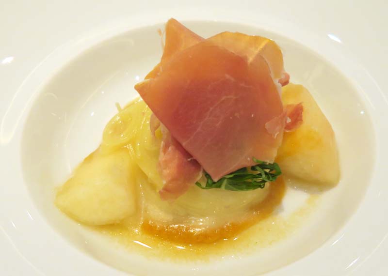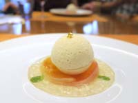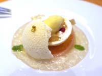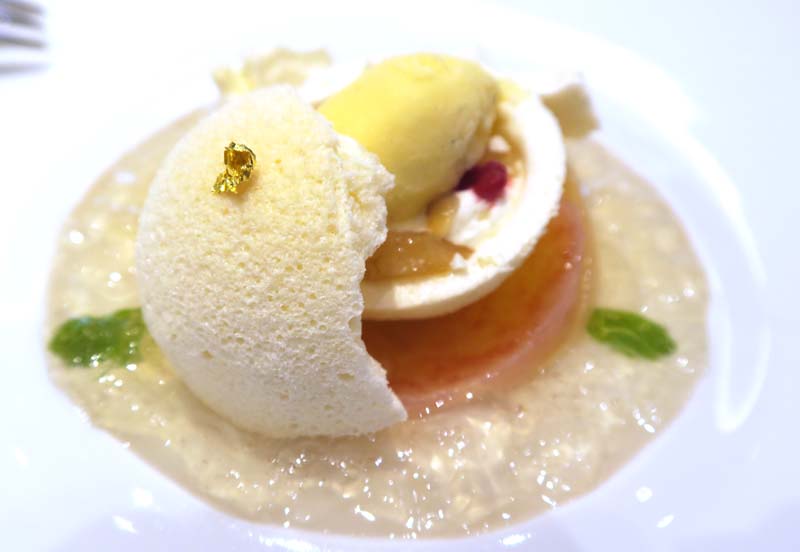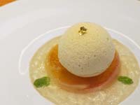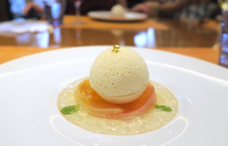 後半は趣向を凝らした桃料理の数々。惜しみなくレシピを教えてくださるシェフ。冷製桃のカッペリーニの作り方の秘訣。だからほどよい冷え加減。コースの中でいちばんのお気に入り。そして鴨の苦手な私は、一皿前に、「別のものに変えることは無理ですよね。」とダメ元で訊ねたところ、しばらくしてからOKの返事。このソースには鴨がいちばん合うということでしたが、牛との相性もよく、完食。