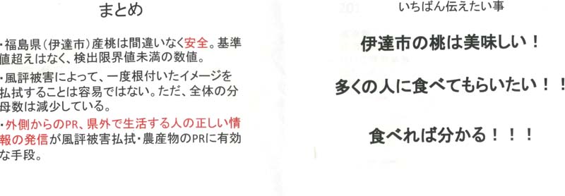 会の前半には伊達市の紹介、東日本大震災以降の苦悩、除染後の現状の話を聞きました。基準値100ベクレルを超える桃は平成24年以降なし、検出限界値未満の値となっているとのこと…。風評被害払拭のため、きちんと説明されていました。知りたいのは実態被害ですが、予防措置原則は全く浸透していません。でも今日の桃は思いっきりいただきます。