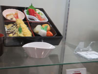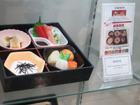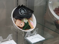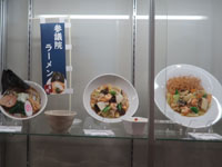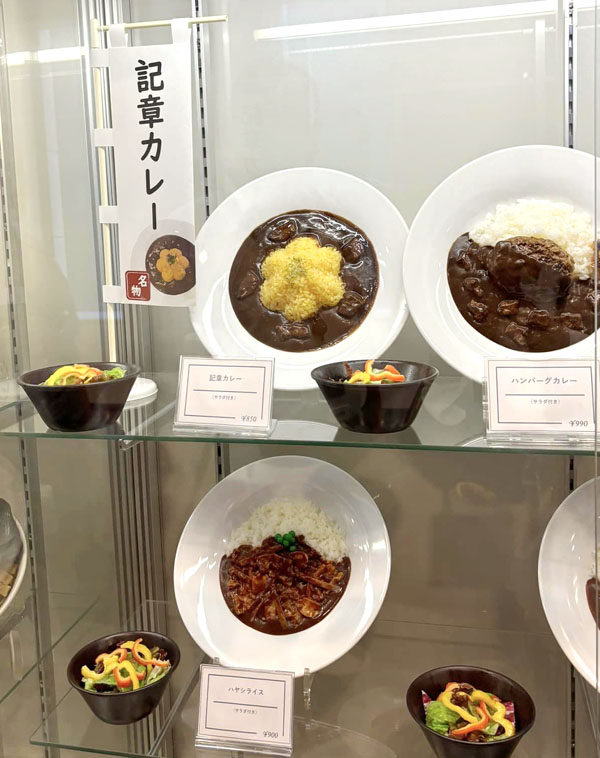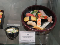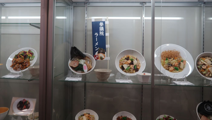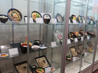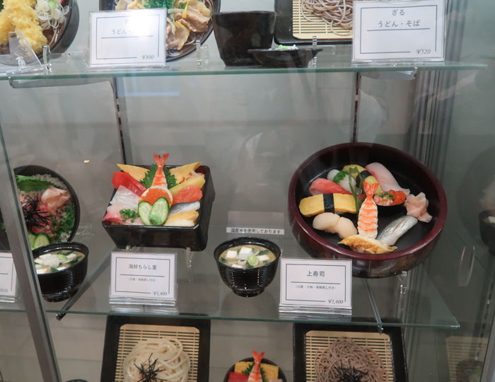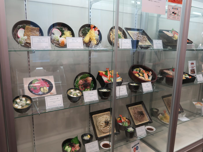 | 広々とした食品サンプルショーケース、値札が伏せられているもの多し |