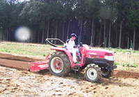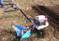 Oさんが耕運機で畑を耕している。
